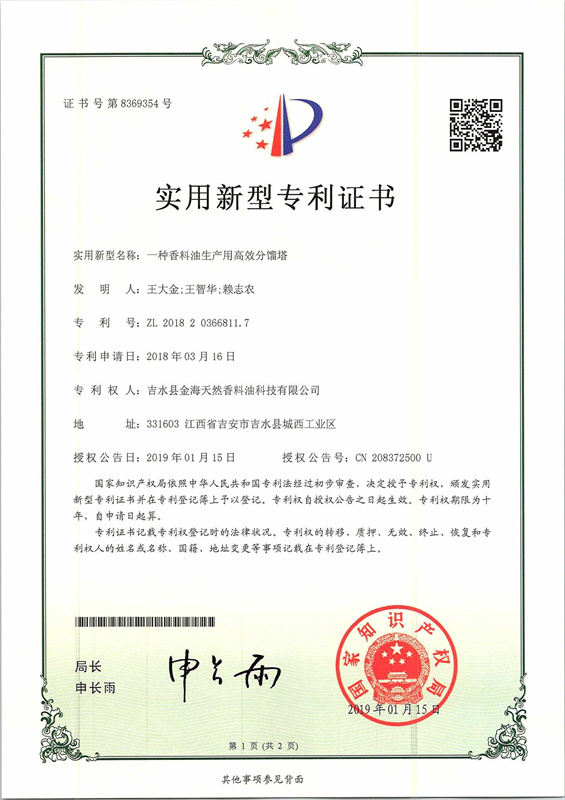 专利证书 - 吉水县金海天然香料油科技有限公司